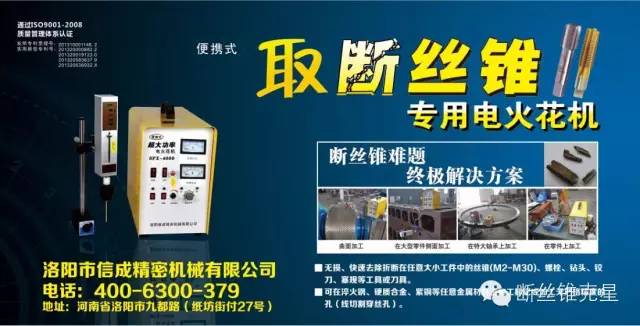 HHJ系列、YT系列“取斷絲錐電火花機”,體積小重量輕,可方便去除折斷在任意大小工件中的斷絲錐、斷鉆頭等,尤其適用于在電火花機床上加工的大型 工件。超大功率電火花機SFX-4000,在技術上實現了重大突破,加工范圍及效率大幅提高,可以取M2-M50的斷絲錐,斷螺絲,斷鉆頭,斷鉸刀等!