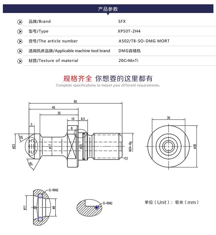 SFX森精機XP50T-2H4雙O型圈數(shù)控拉釘 通孔通水CNC加工中心拉釘、結(jié)構(gòu)平衡螺母 簡介: 咨詢熱線:400-6700-379 留言給我們 產(chǎn)品詳細(xì) 上一篇:LDB40-T7.35-47 辛辛那提機床拉釘 下一篇:BT-CAT50-45°U/TO-6.3牧野機床拉釘 分享到:0 用手機看 拍下二維碼,信息隨身看 試試用微信掃一掃,在你手機上繼續(xù)觀看此頁面。